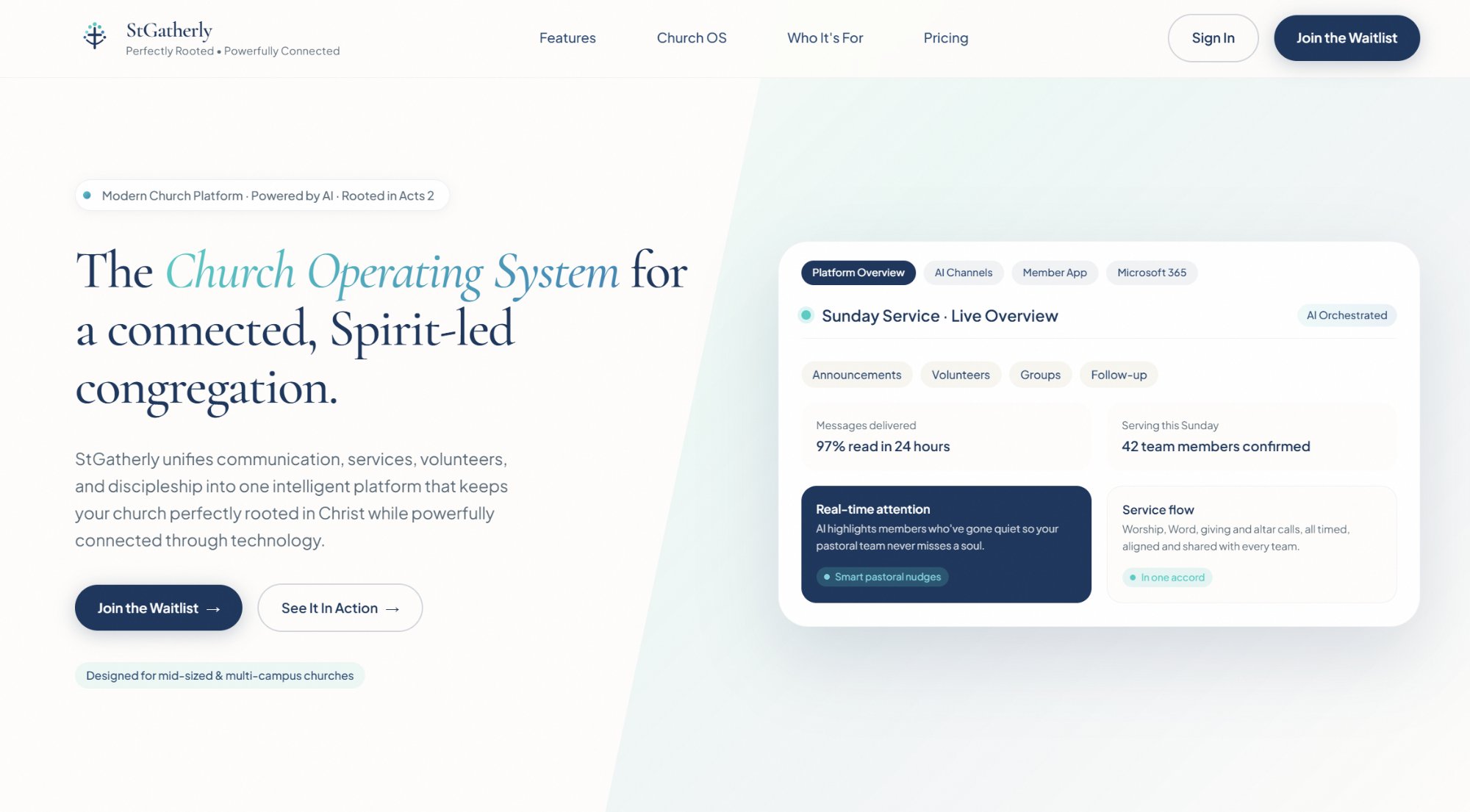 Full back-office administration for churches: service management, check-ins, registrations, contact management, and giving oversight.